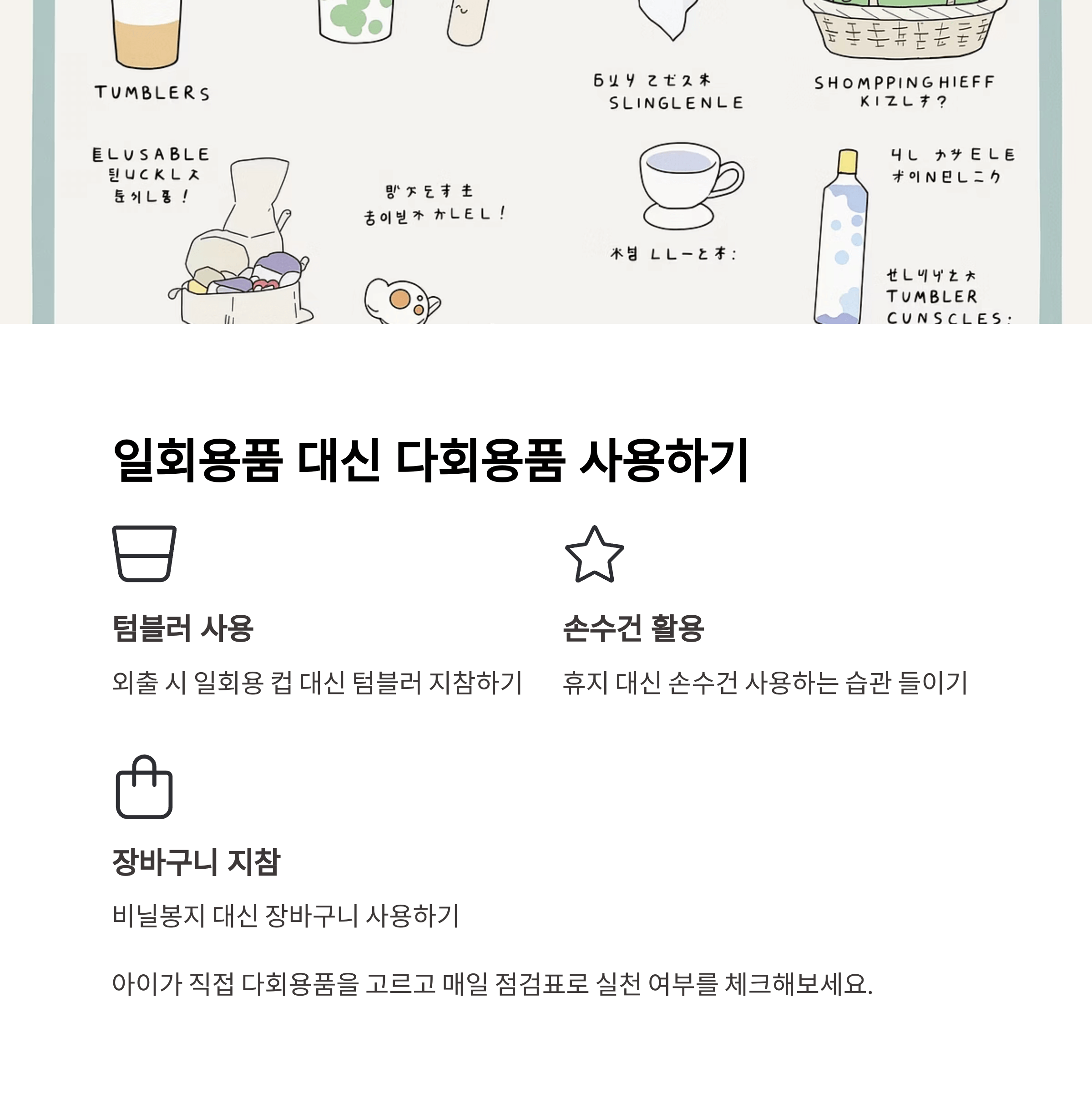 텀블러, 손수건, 장바구니 사용은 생각보다 큰 변화를 가져옵니다. 외출 시 일회용 플라스틱 컵 대신 텀블러를 사용하고, 휴지는 손수건으로 대체해 보세요. 아이가 다회용품을 직접 고르고 사용할 수 있도록 유도하면 흥미도 생기고 책임감도 기를 수 있습니다. 매일 점검표를 만들어 실천 여부를 체크해 보는 것도 추천합니다.