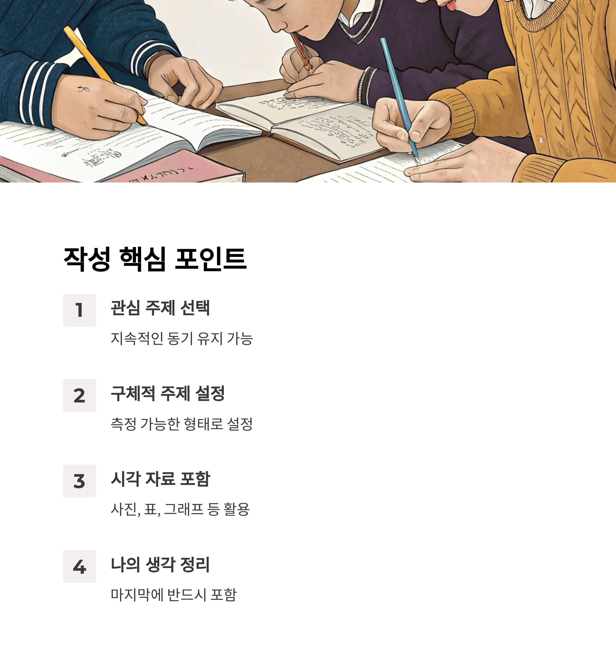 - 2단계: 자료 조사 – 책, 논문, 인터넷 기사 등 다양한 자료를 활용하고, 정보의 신뢰성을 확인하세요.
