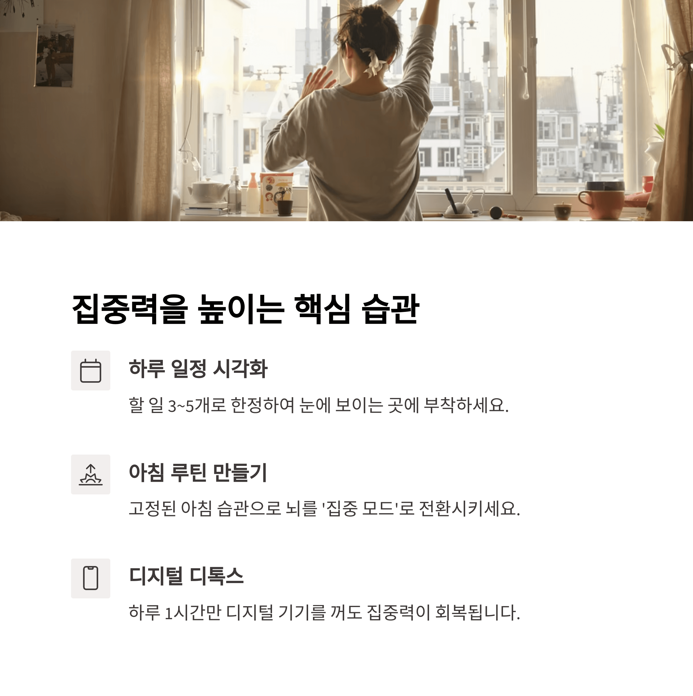 아침에 일어나는 시간과 행동이 고정되어 있으면 뇌가 ‘집중 모드’로 전환되는 속도가 빨라집니다. 뇌는 반복되는 습관을 통해 신경 회로를 강화하기 때문입니다.