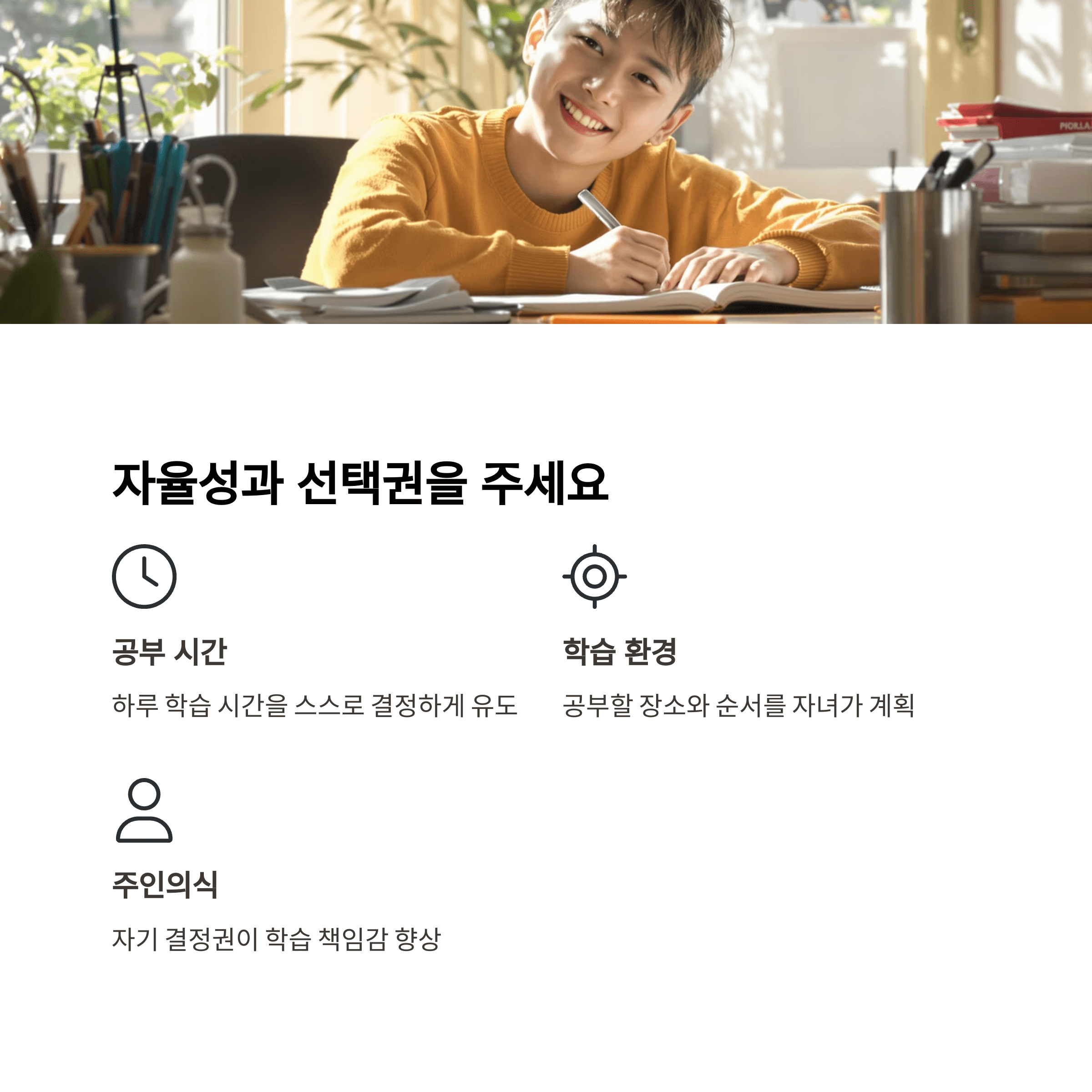 공부 계획이나 과목 순서를 스스로 결정하게 하면 책임감과 자긍심이 향상됩니다.
