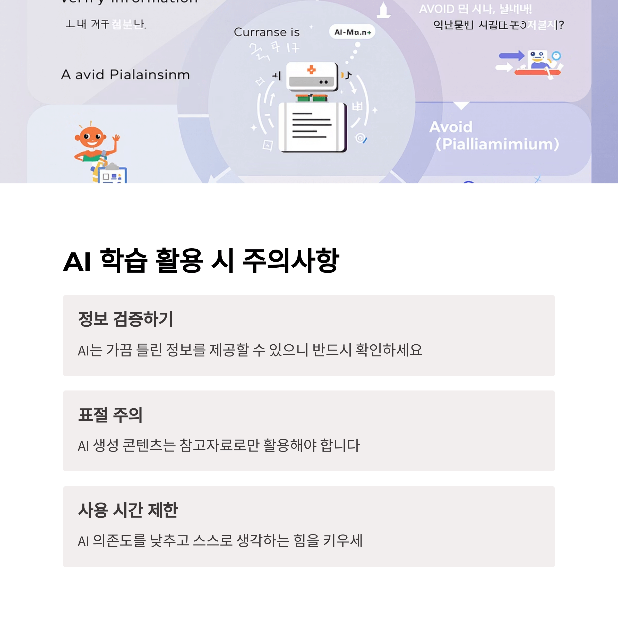 AI를 공부에 활용하는 것은 매우 유익하지만, 무조건적인 의존은 바람직하지 않습니다. 다음 사항을 고려하며 아이의 학습을 지도해 주세요: