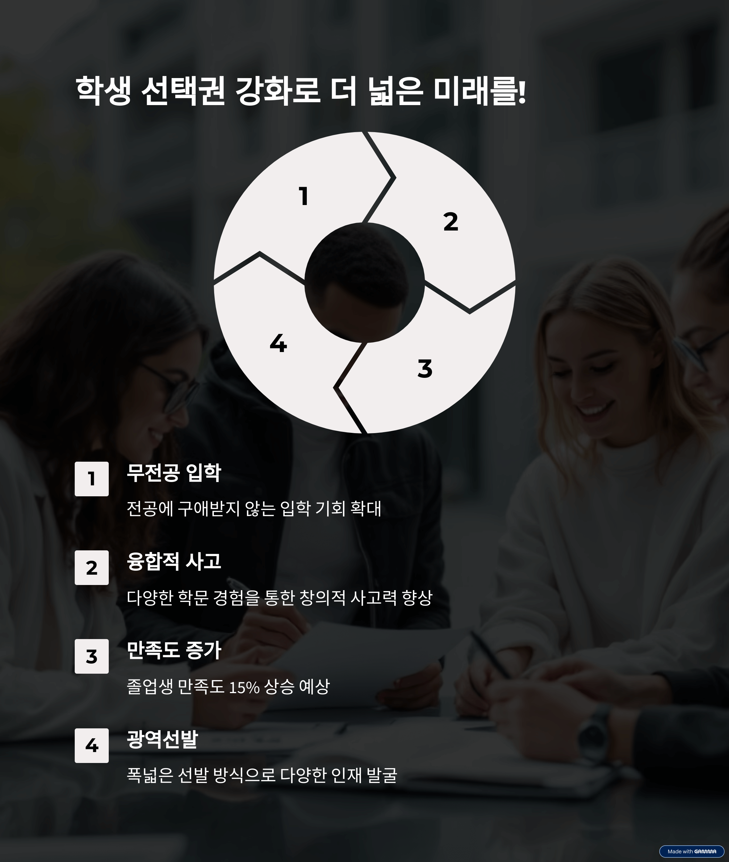 학생들은 입학 후 자유롭게 자신의 적성과 흥미를 탐색하며, 하나 이상의 전공을 선택해 2~3개의 전공 학위를 취득할 수 있습니다. 이는 단일 전공 중심 교육에서 벗어나 융합형 인재를 양성하려는 취지입니다. 특히 과학·공학 분야와 같이 빠르게 변화하는 산업 구조에 적응할 수 있는 인재를 양성하는 데 큰 도움이 될 것으로 기대됩니다.