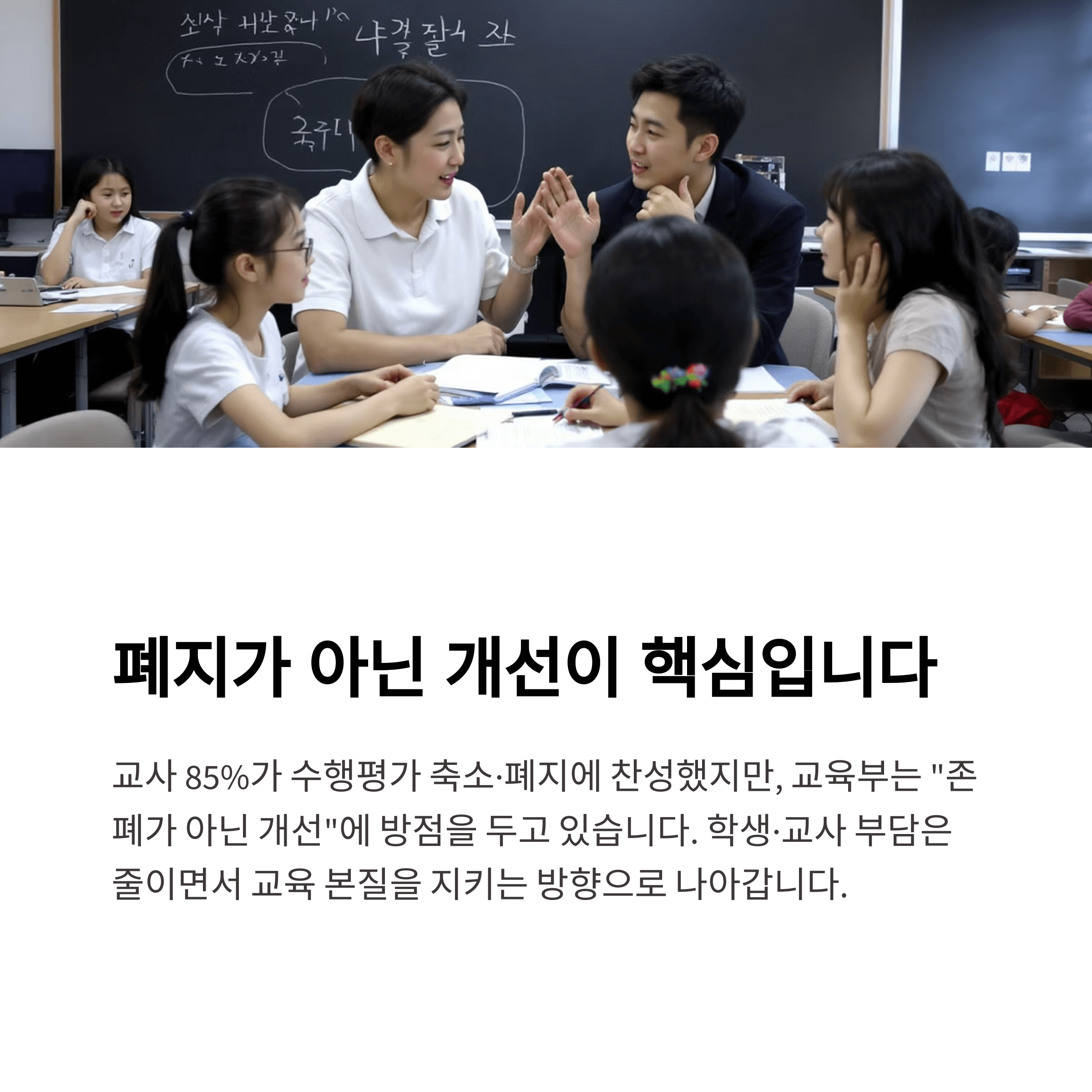 교육부는 수행평가 자체의 가치를 인정하며, “존폐가 아니라 개선”에 방점을 두고 있습니다.