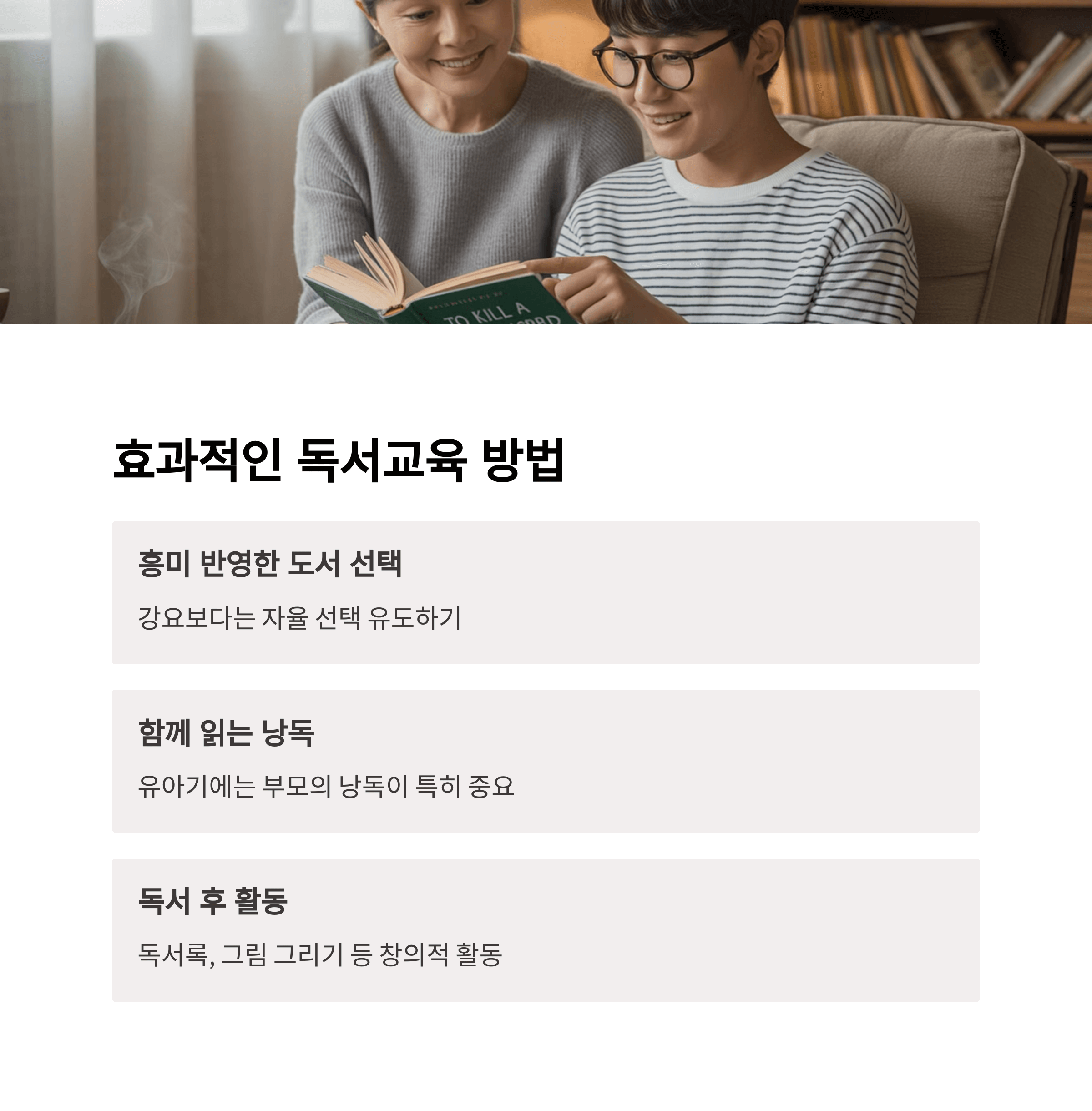 - 읽어주는 독서(낭독): 특히 유아기에는 부모의 낭독이 중요
