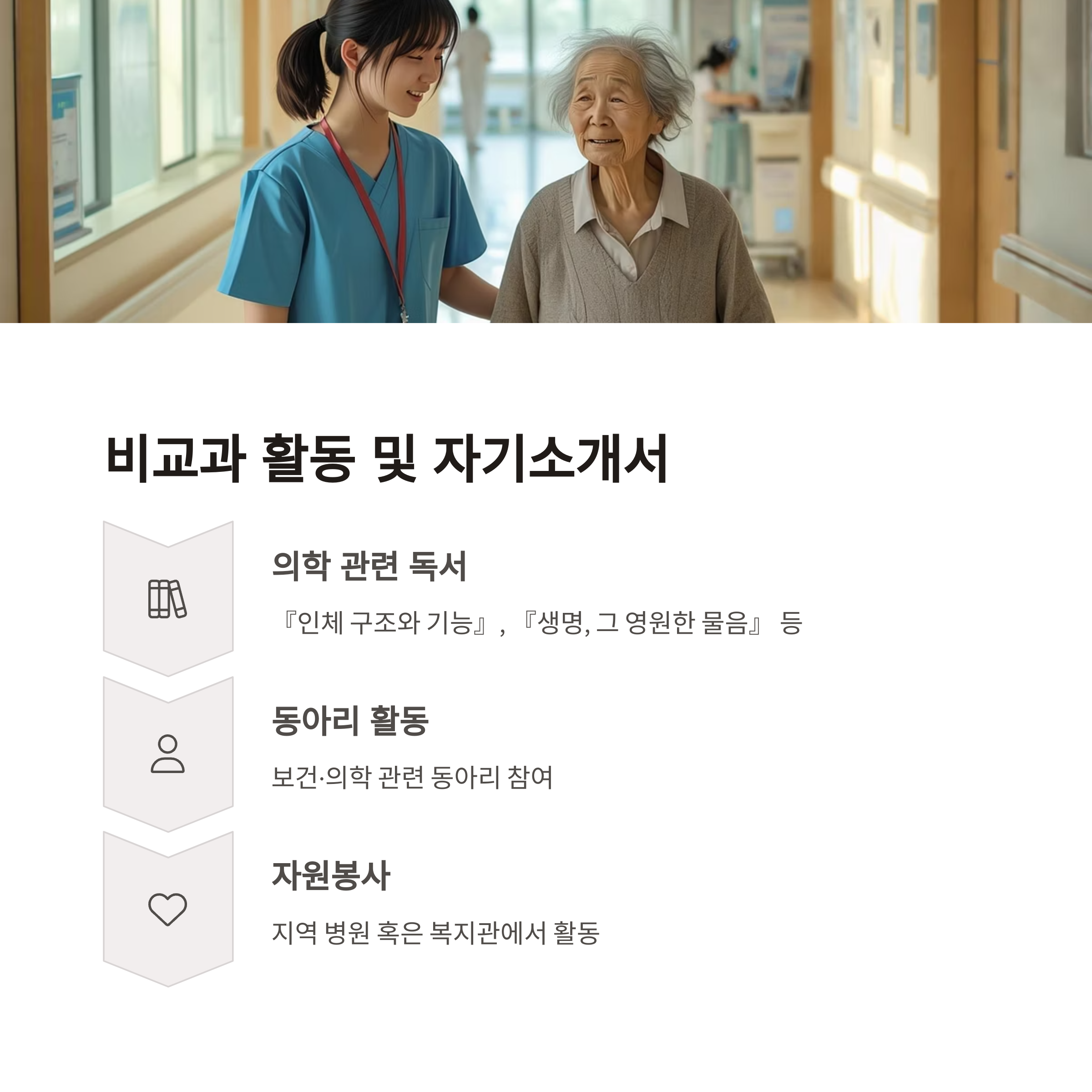 - 비교과 활동: 의학 관련 독서, 봉사, 동아리, 주도적 경험 강조