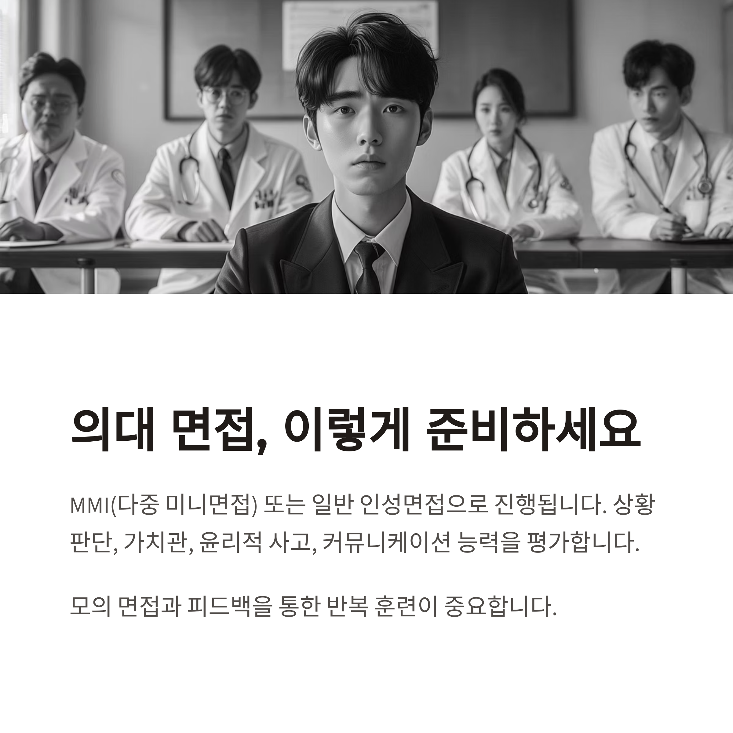 - 의대 면접: 인성 + 상황판단 중심 (MMI 또는 일반면접)