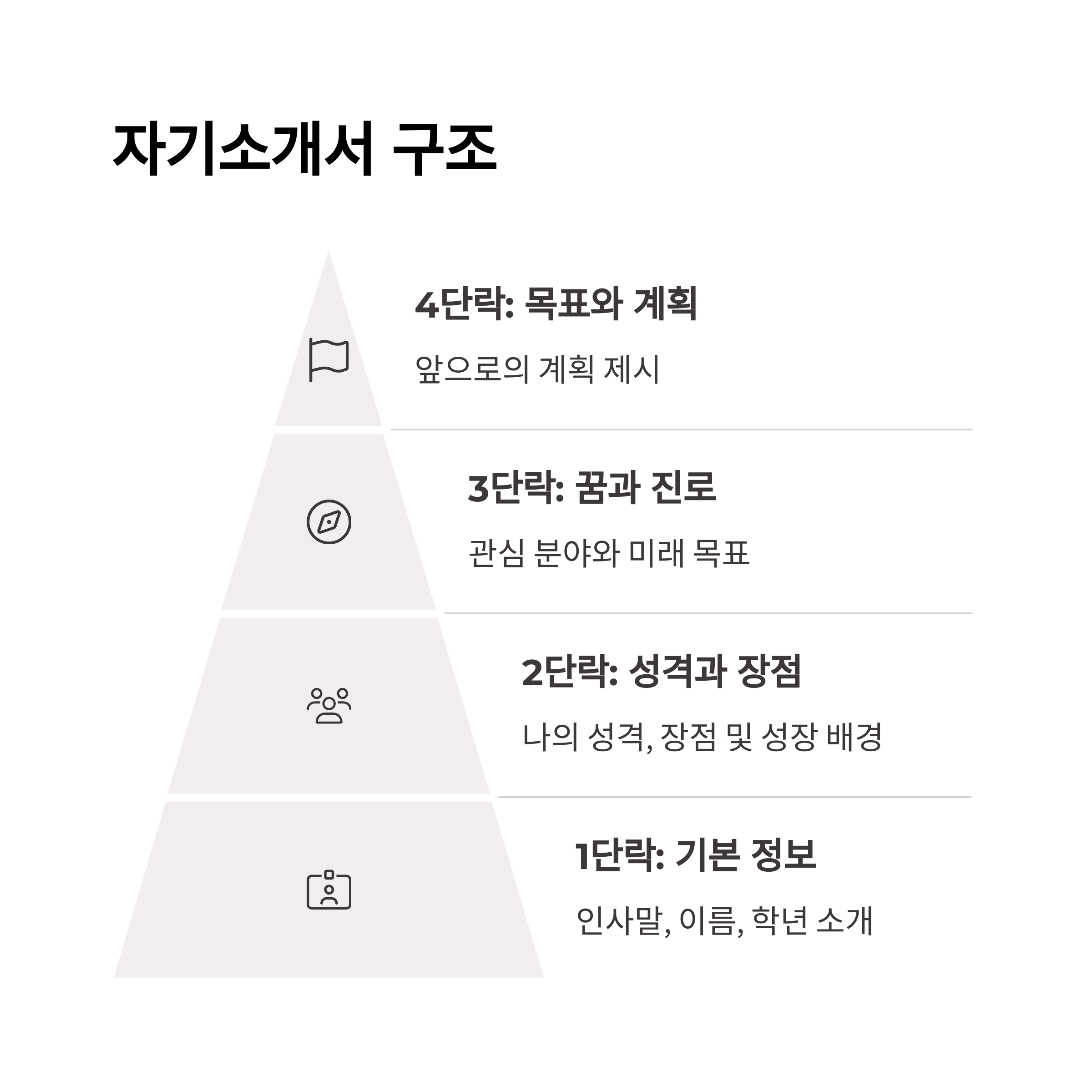 자기소개서를 쓸 때에는 단락 구성과 흐름이 매우 중요합니다. 아래와 같은 구조를 따라 작성해 보세요.