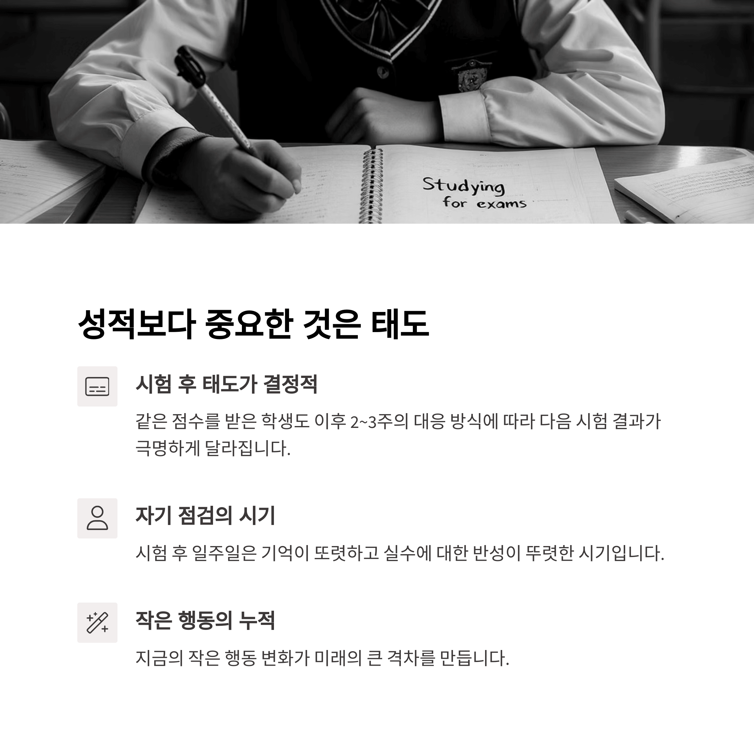 또한, 이 시기의 태도는 단순한 성적 향상을 넘어서 장기적인 학습 습관 형성에 결정적인 역할을 합니다. 시험 결과는 바꿀 수 없지만, 이후의 행동은 언제든지 바꿀 수 있습니다. 지금의 작은 행동이 누적되어 미래의 격차를 만듭니다.