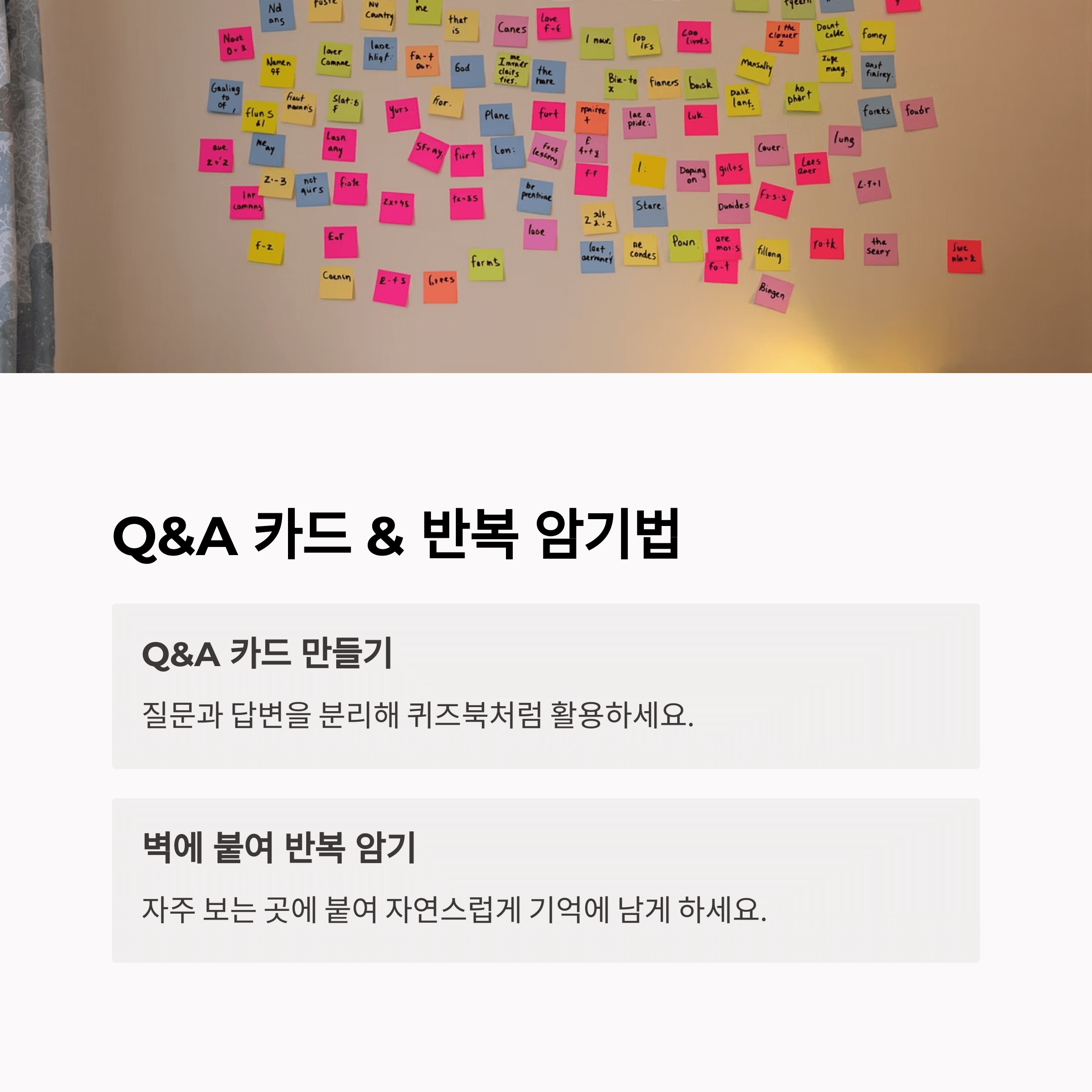 침대 앞, 책상 옆, 화장실 문 등 자주 보는 곳에 포스트잇을 붙여보세요. 자연스럽게 반복 노출되어 기억에 남기 쉬워집니다. 특히 단어 암기나 수학 공식 외우기에 효과적입니다. 포스트잇을 2~3일에 한 번씩 바꿔가며 새로운 내용을 업데이트하면 학습 효과가 지속됩니다. 시험 기간에는 전 과목 핵심 요약 포스트잇 벽을 만들어도 좋습니다.