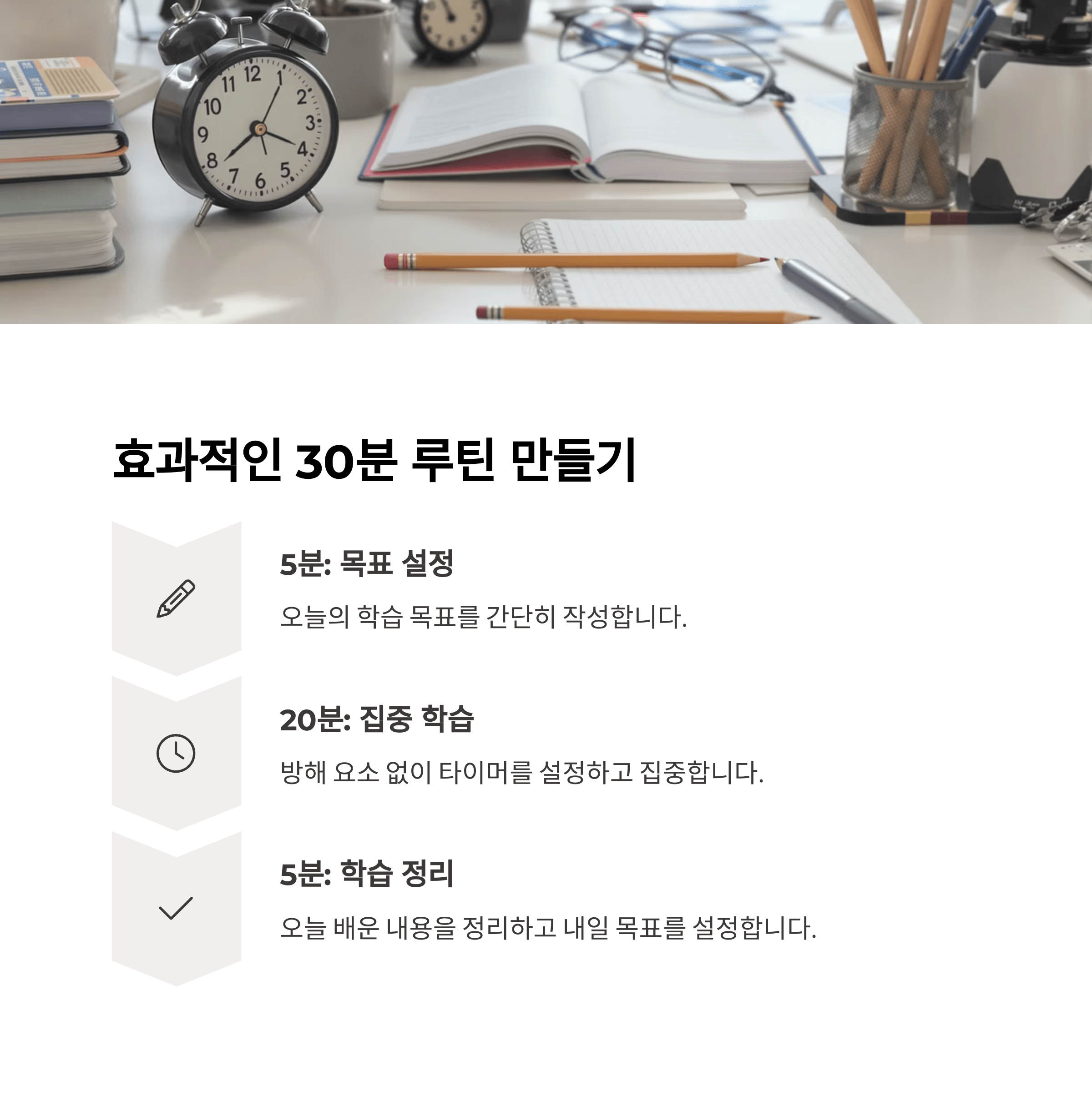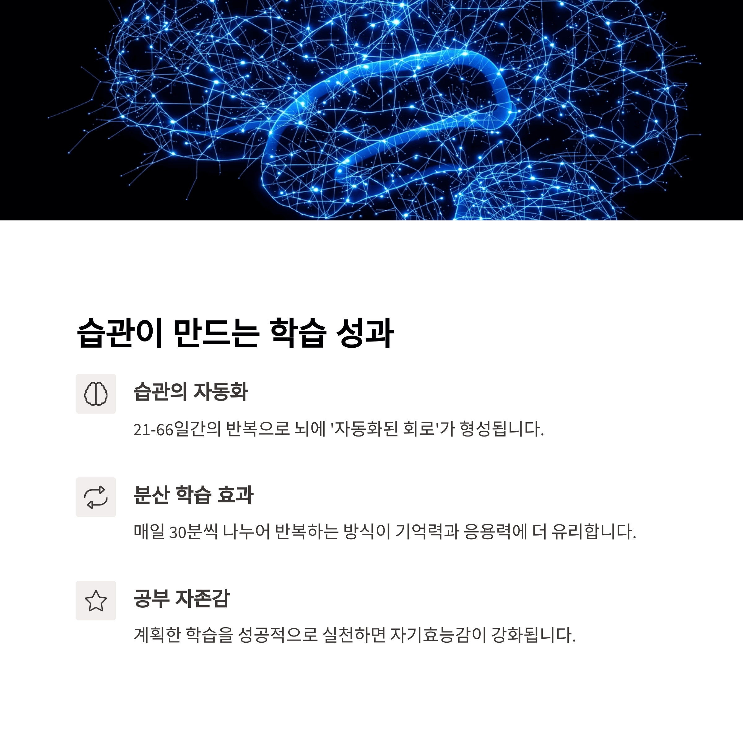 이처럼 매일 같은 패턴을 반복하면 뇌는 자동적으로 ‘이 시간은 공부하는 시간’이라고 인식하고, 습관 회로가 강화됩니다. 3주만 꾸준히 실천하면 공부에 대한 거부감보다 익숙함이 앞서게 됩니다.