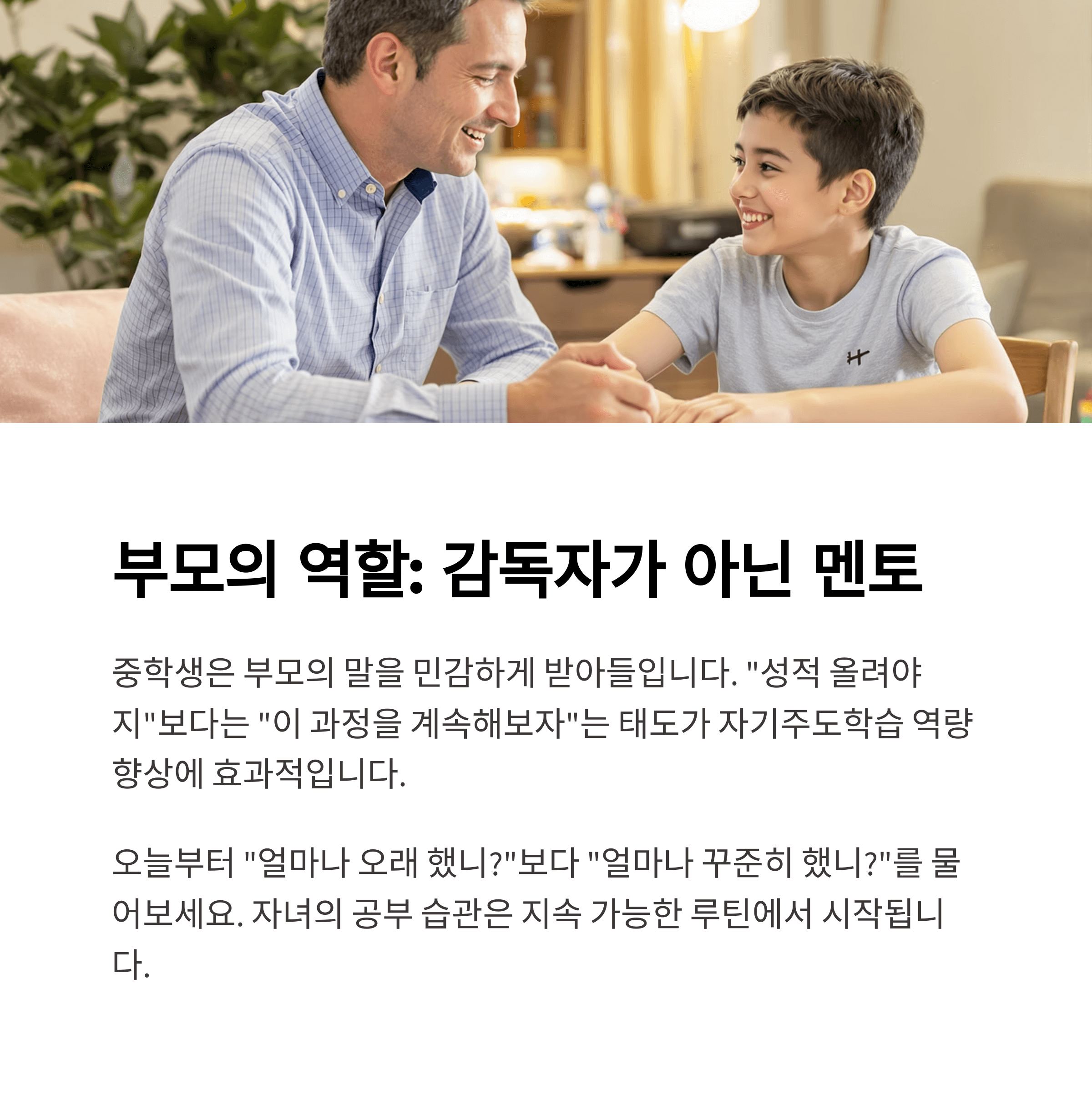 중학생은 부모의 말을 민감하게 받아들이는 시기입니다. 이때 부모가 '감시자'로 느껴지면 학습에 대한 반감만 커집니다.