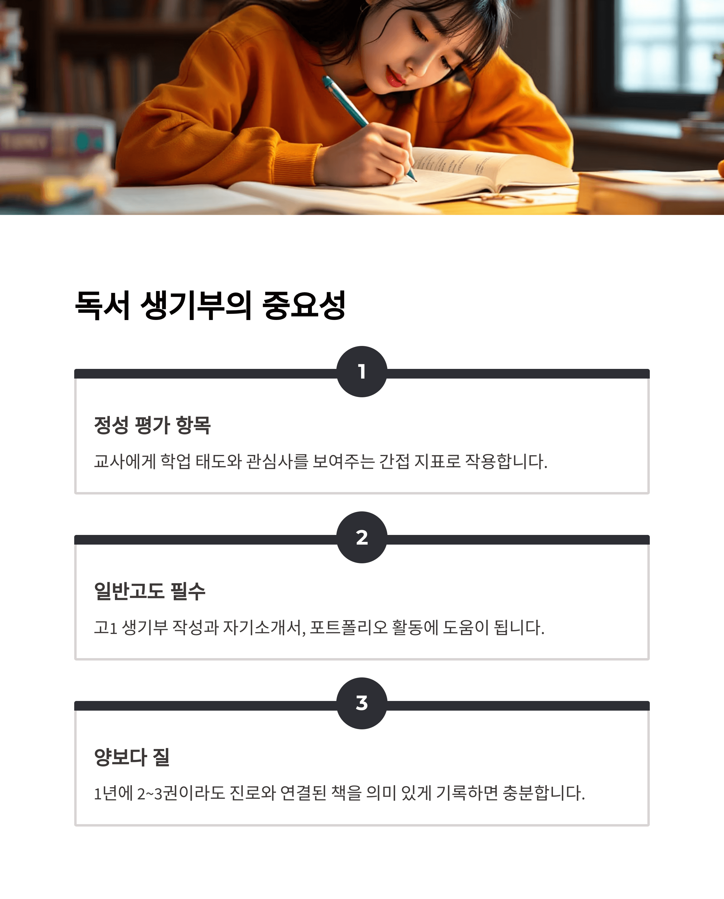 많은 중학생과 학부모님들이 묻습니다. “독서 생기부, 고등학교나 대학 갈 때 진짜 영향이 있나요?” 결론부터 말씀드리면, 점수화는 되지 않지만 분명히 영향력 있는 항목입니다. 특히 진로 탐색과 자기주도 학습, 고교 입학 이후 학생부종합전형(학종)까지 고려한다면, 지금의 독서 활동은 작지만 중요한 씨앗이 될 수 있어요.