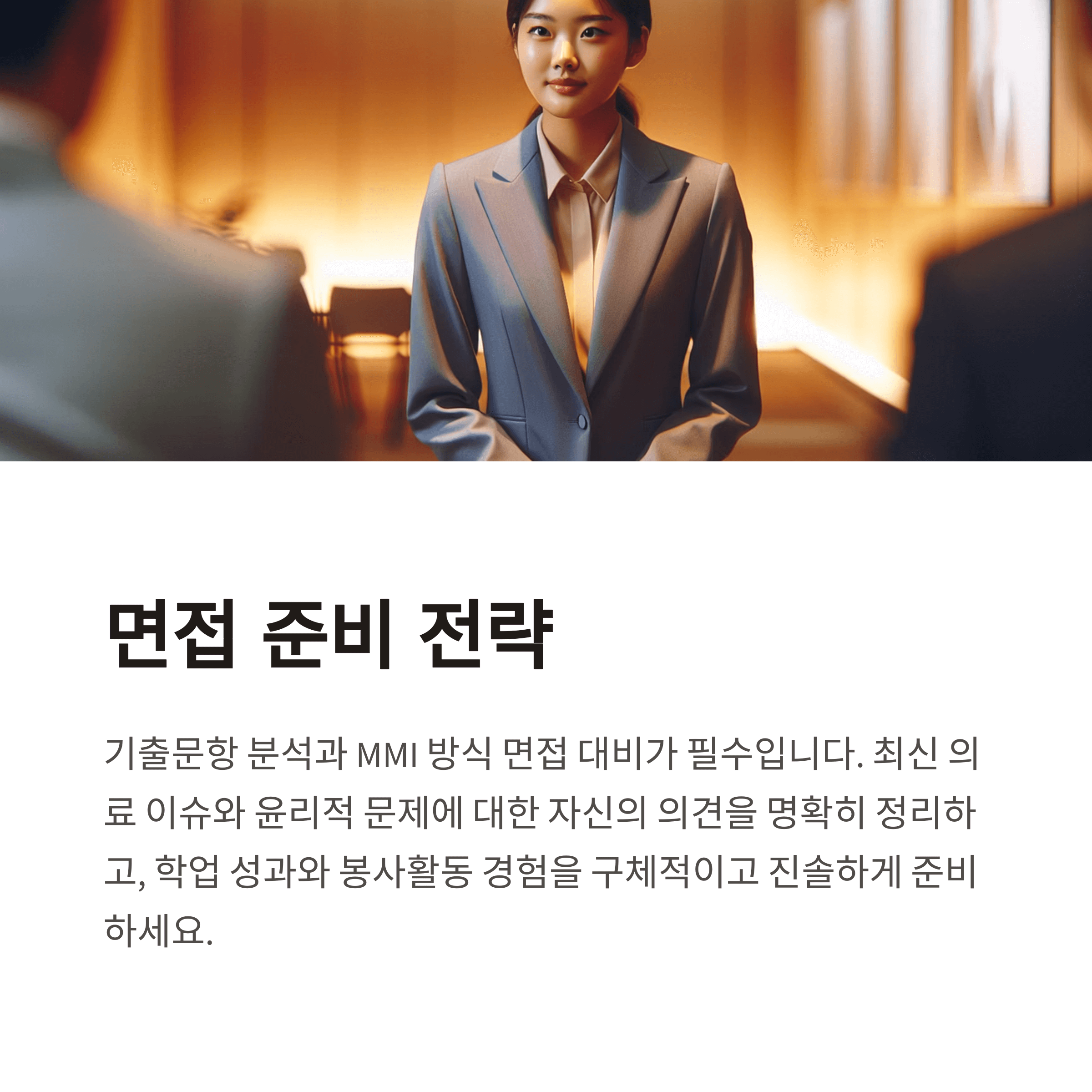 정리하면 단순한 ‘전문성’, ‘책임감’ 이상의 자질이 요구됩니다. ‘공감능력’, ‘의사소통’, ‘윤리적 판단력’ 등 인간 중심 의료에 초점이 맞춰지고 있으며, MMI 방식의 도입으로 상황 기반 질문이 증가하고 있습니다.