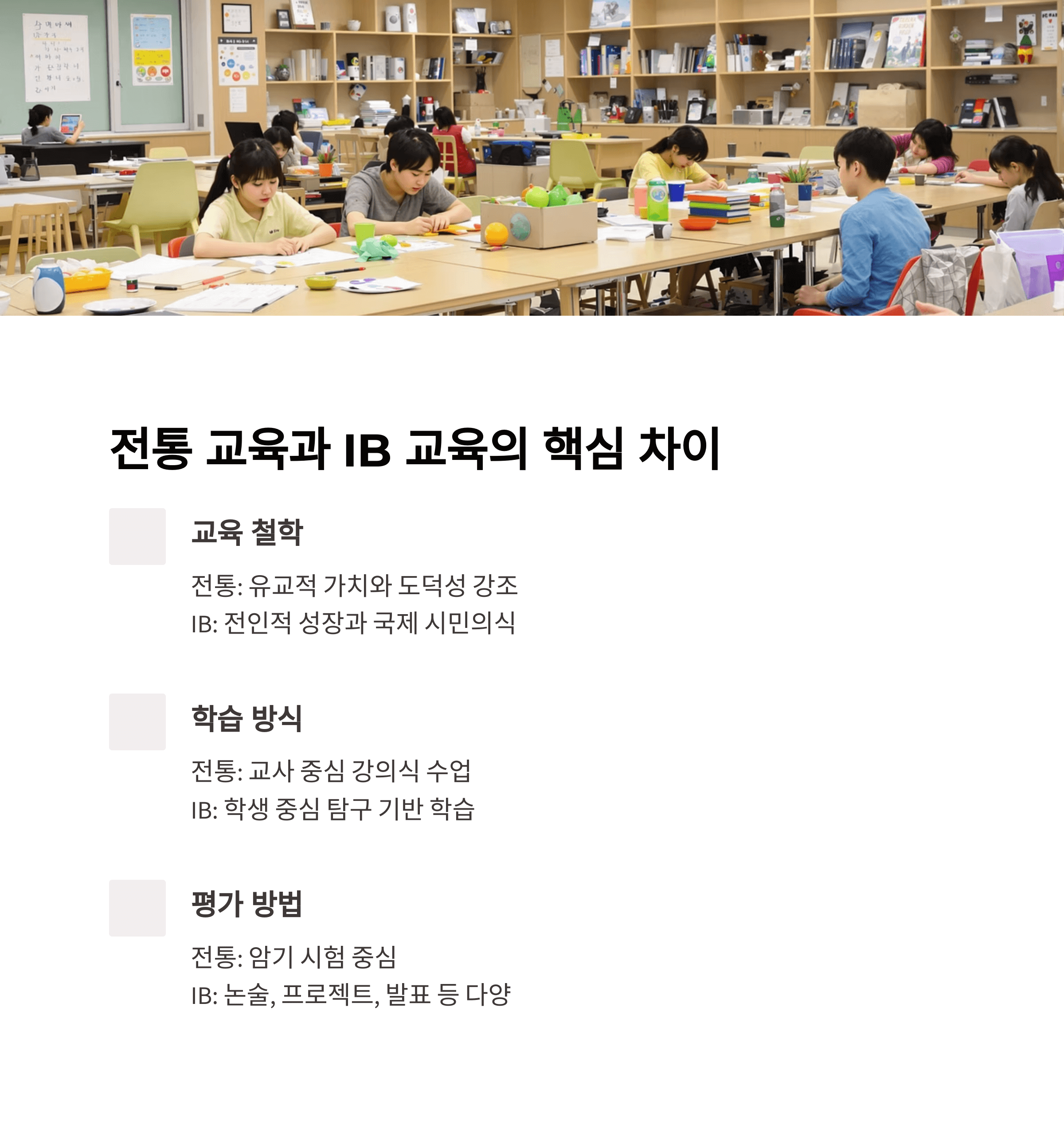 - 평가 방법: 전통 교육은 주기적 암기 시험 중심, IB 교육은 논술형, 프로젝트, 발표 등 다양한 평가 방식