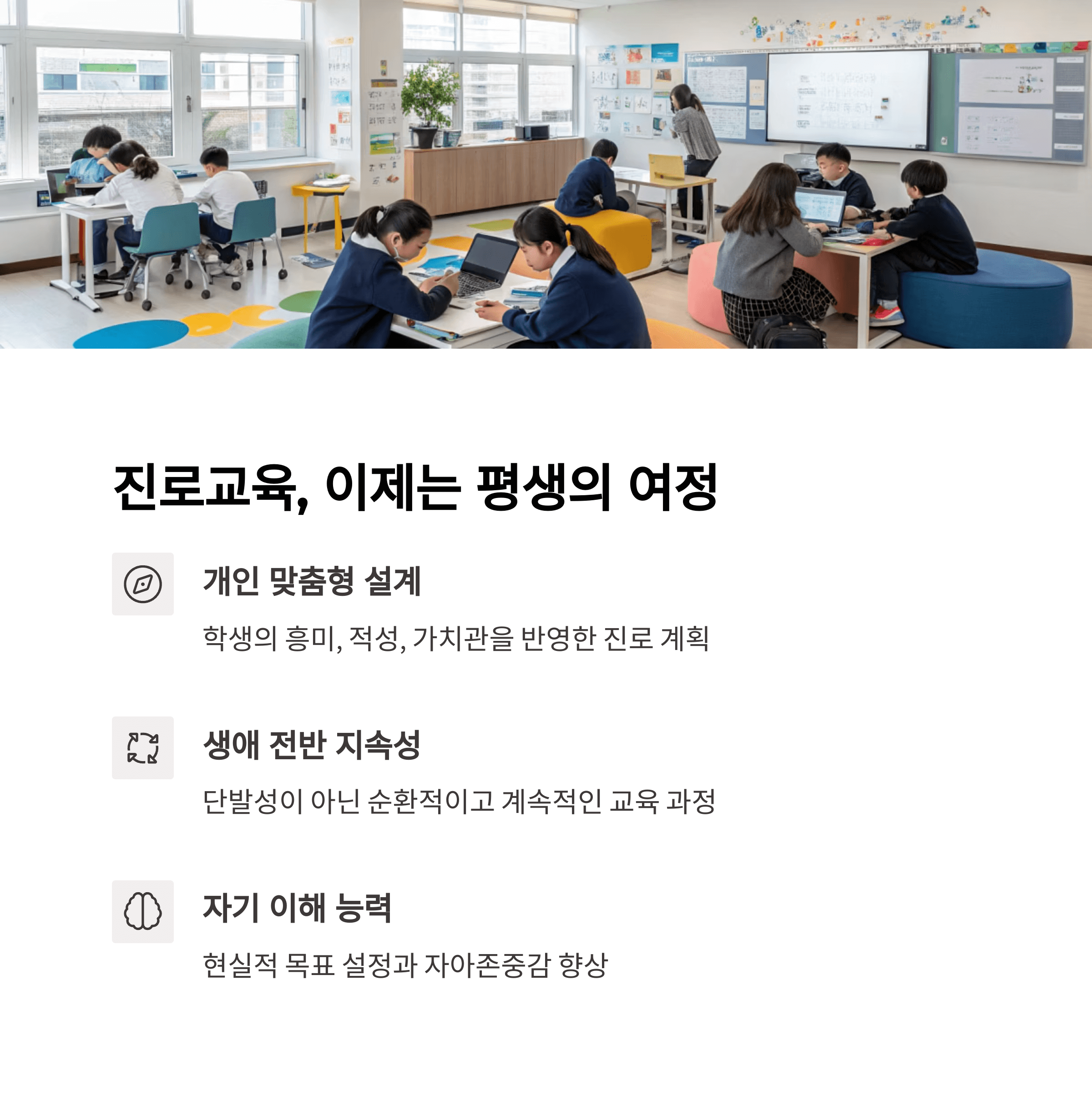 - 전 생애 진로교육 체계화: 학생부터 성인, 재직자까지 연계된 진로교육 체계 마련
