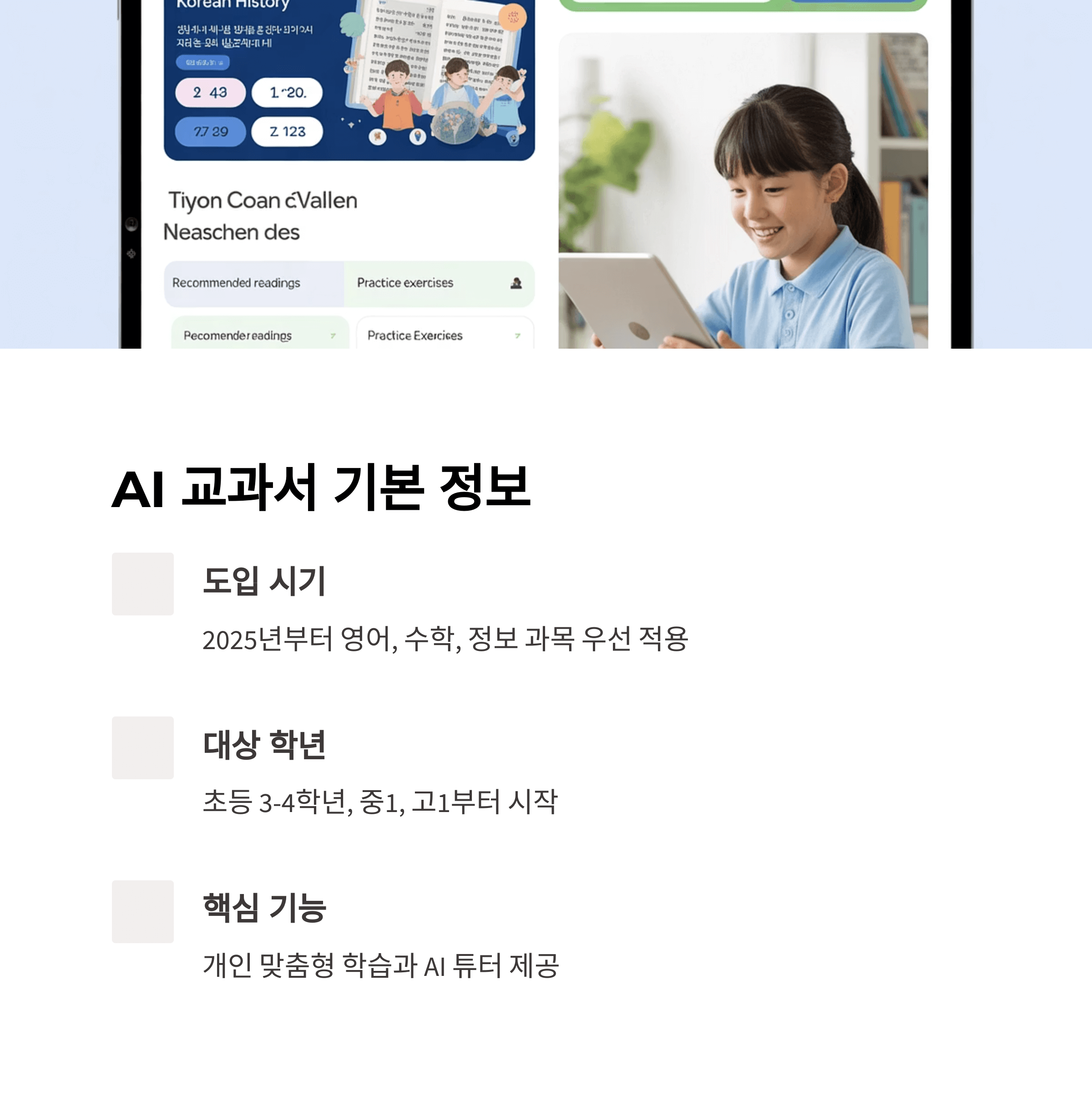 2025년 대한민국 교육의 판도가 바뀝니다. 교육부가 주도하는 AI 디지털교과서 도입은 학생 맞춤형 학습 시대를 여는 신호탄이 될 것입니다.핵심 요약:- 2025년부터 초3~고1 대상, 영어·수학·정보